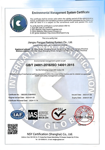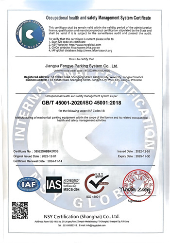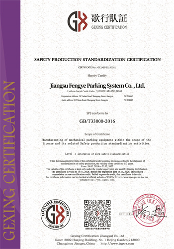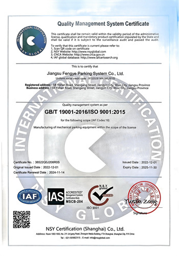 Jiangsu Fengye Parking System Co., Ltd. es una empresa moderna de alta tecnología que se centra en la investigación y el desarrollo, el diseño, la fabricación, las ventas, la instalación y el mantenimiento de sistemas de estacionamiento tridimensionales mecánicos. Está comprometido con la tecnología exquisita de los sistemas de estacionamiento, la innovación continua y la garantía de que se satisfagan las necesidades de diferentes clientes. La tecnología es la fuente de calidad, y la responsabilidad es la garantía de la calidad.